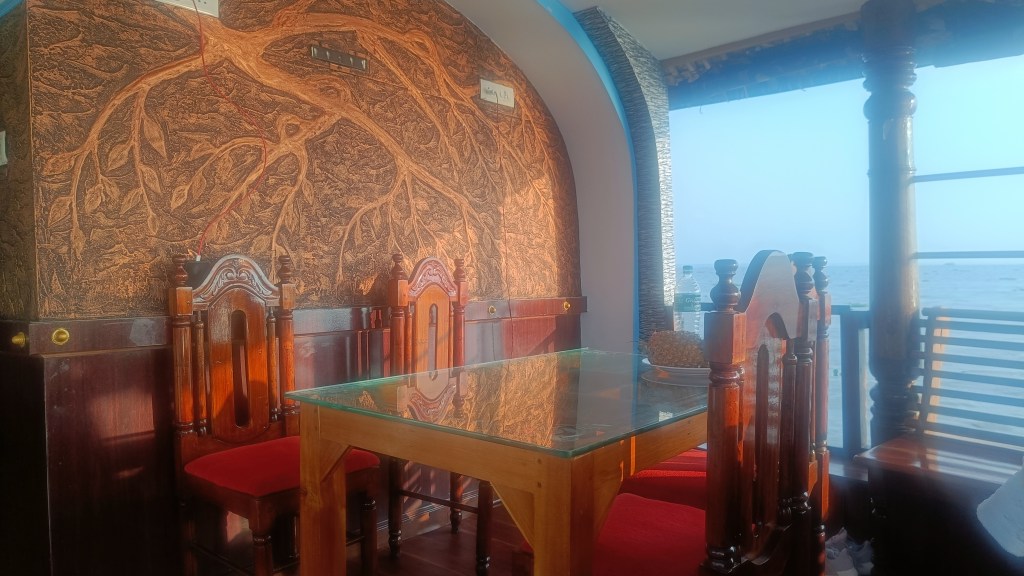 Our boat was a simple one with one bedroom having a large bed. We asked for an extra mattress which was made available. In the living area, there was a dining table and two sofa chairs. The bedroom had glass windows with curtains which gave us the choice to either witness the views by relaxing on the bed or get shut off from the world while sailing on the backwaters. The bedroom had an attached washroom and also an AC.