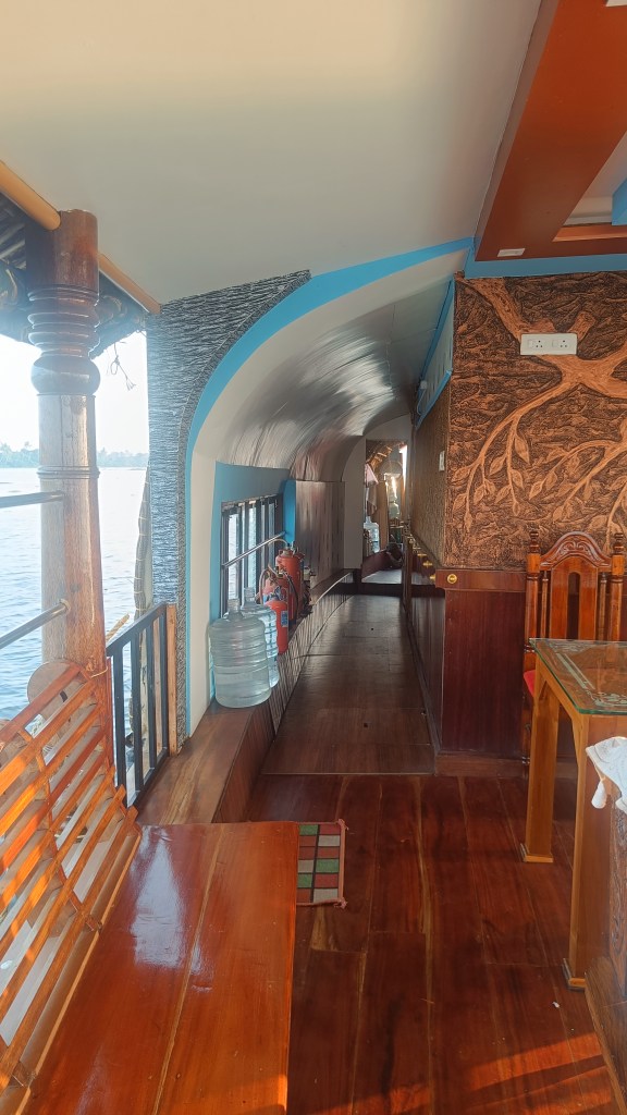 As soon as we reached the houseboat, we were welcomed by the staff on the boat. There were two of them. Since we were just three members, we opted for a boat with a single bedroom. Based on the number of members, one can choose from a wide range of options available there. There were boats with top decks, having double or triple bedrooms. Also, based on the price, the interiors range from deluxe to premium along with other amenities like full time AC, television and music systems etc.
